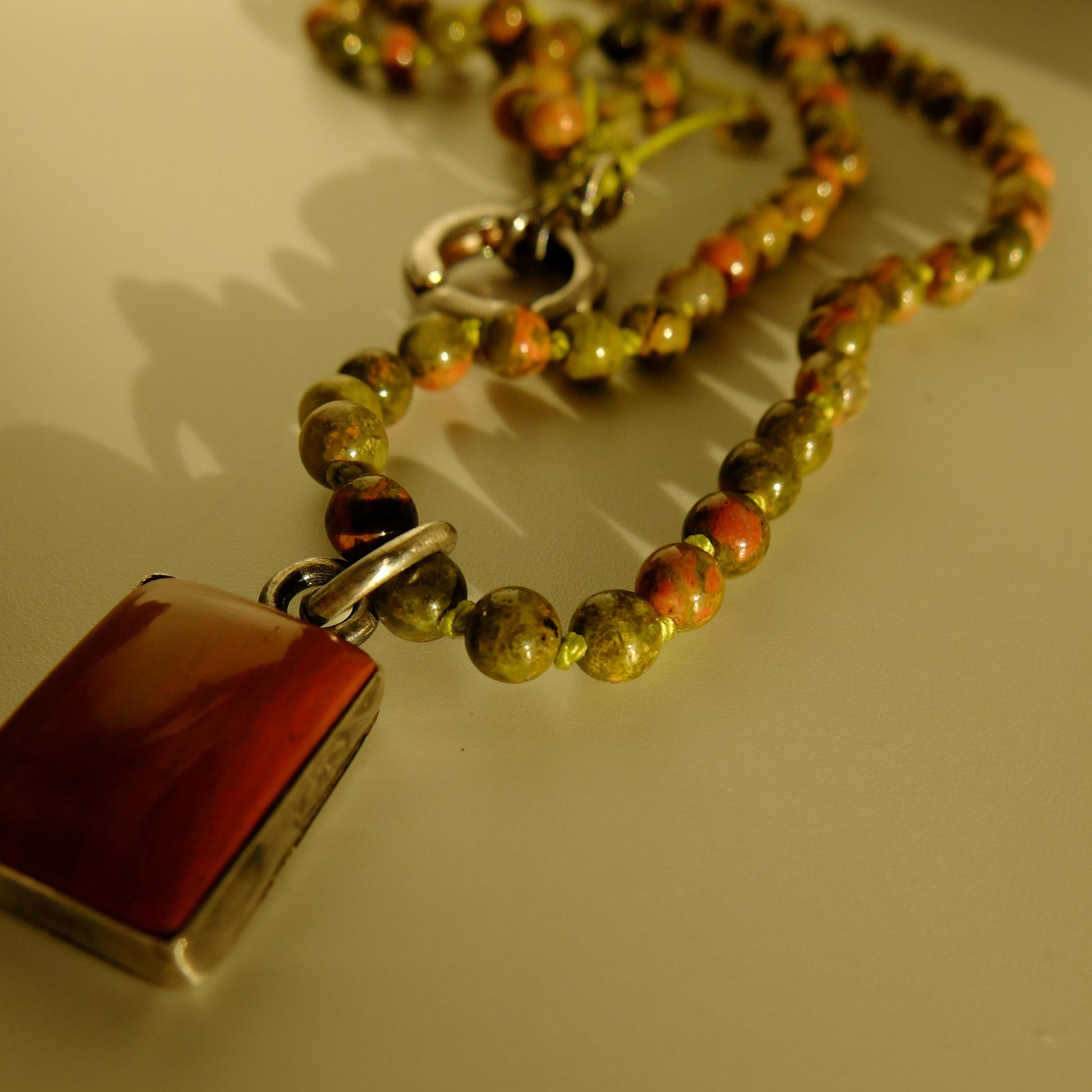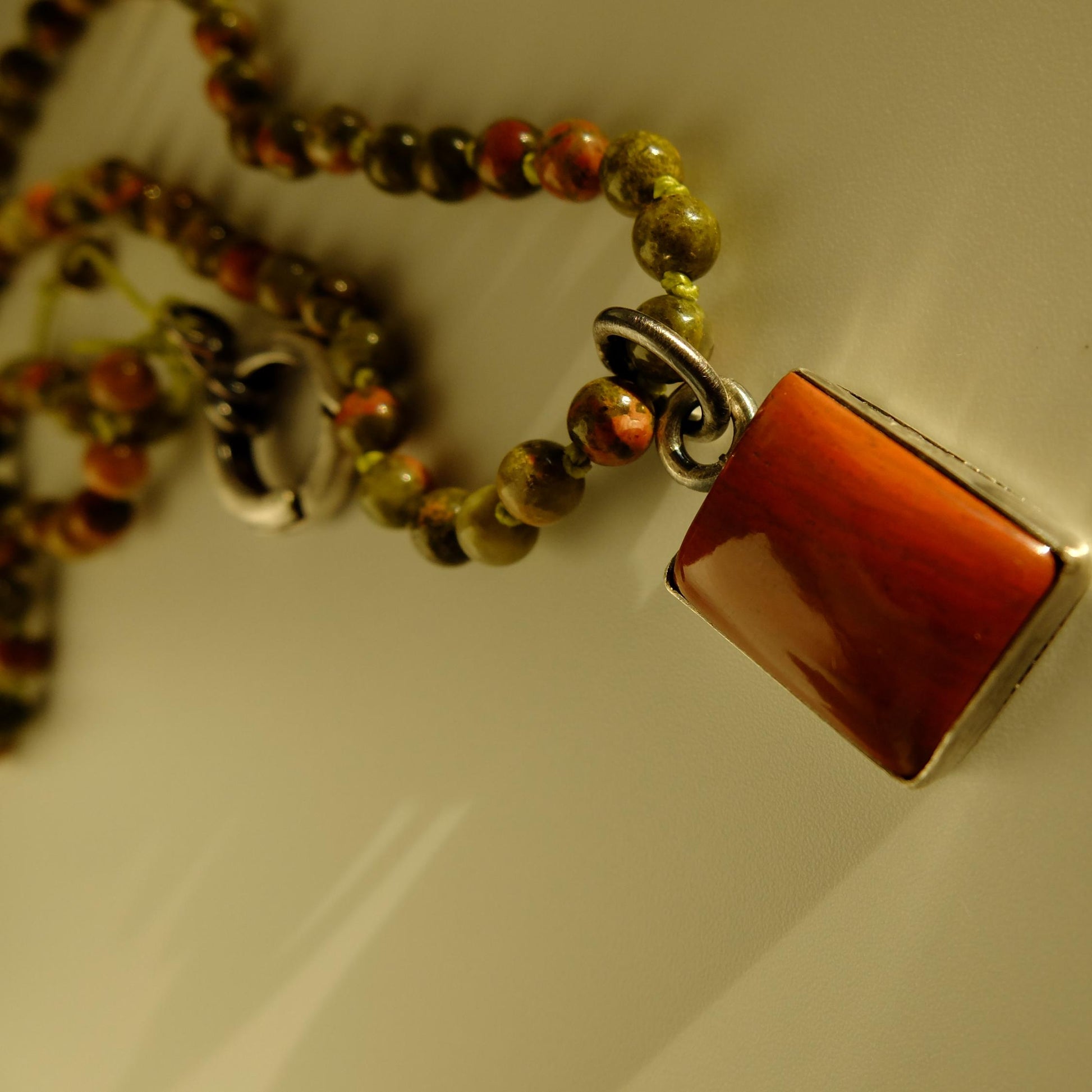 The Camile Red necklace pendant mixes natural Unakite stones with a red japer stone set in Sterling silver.