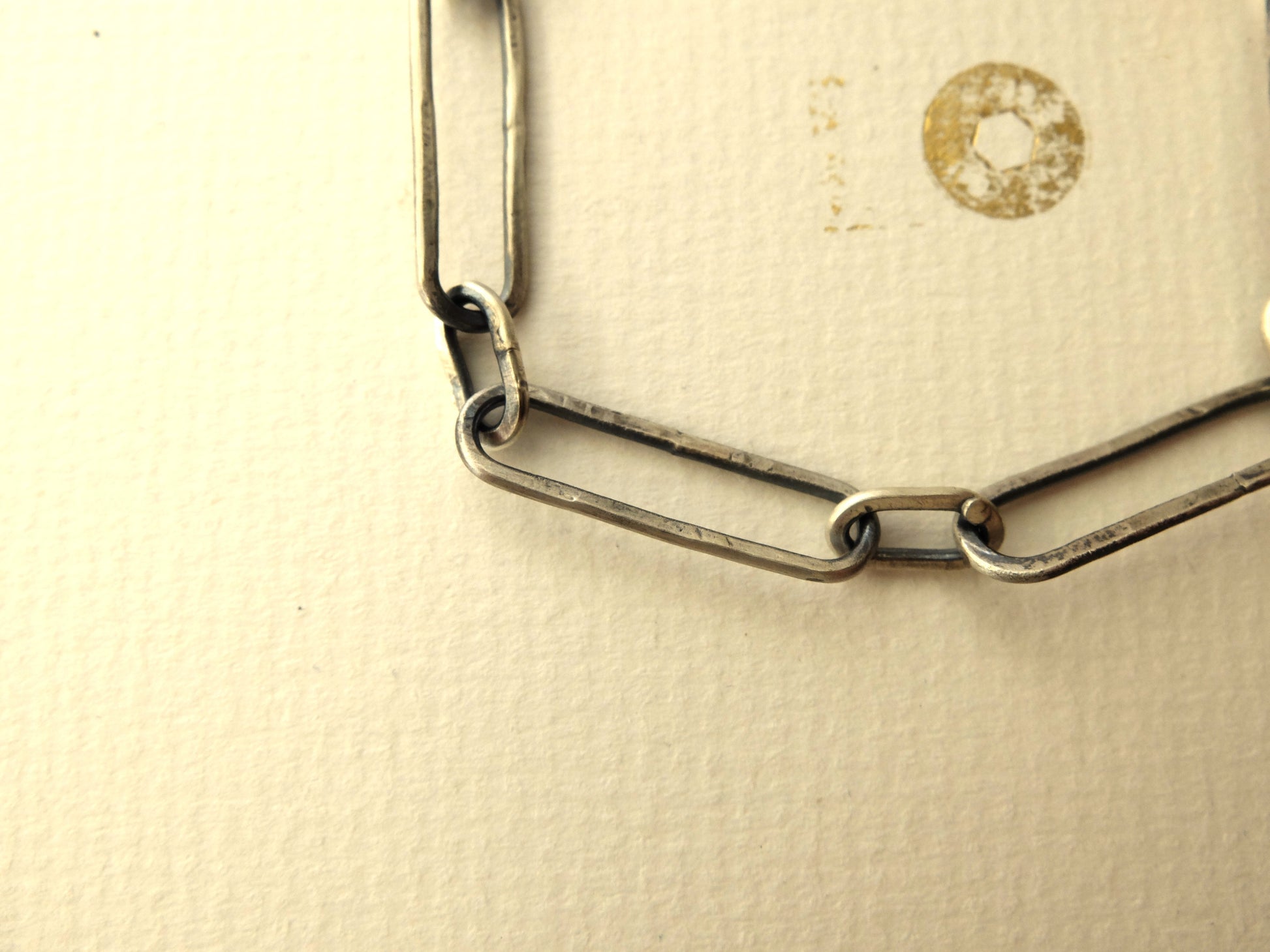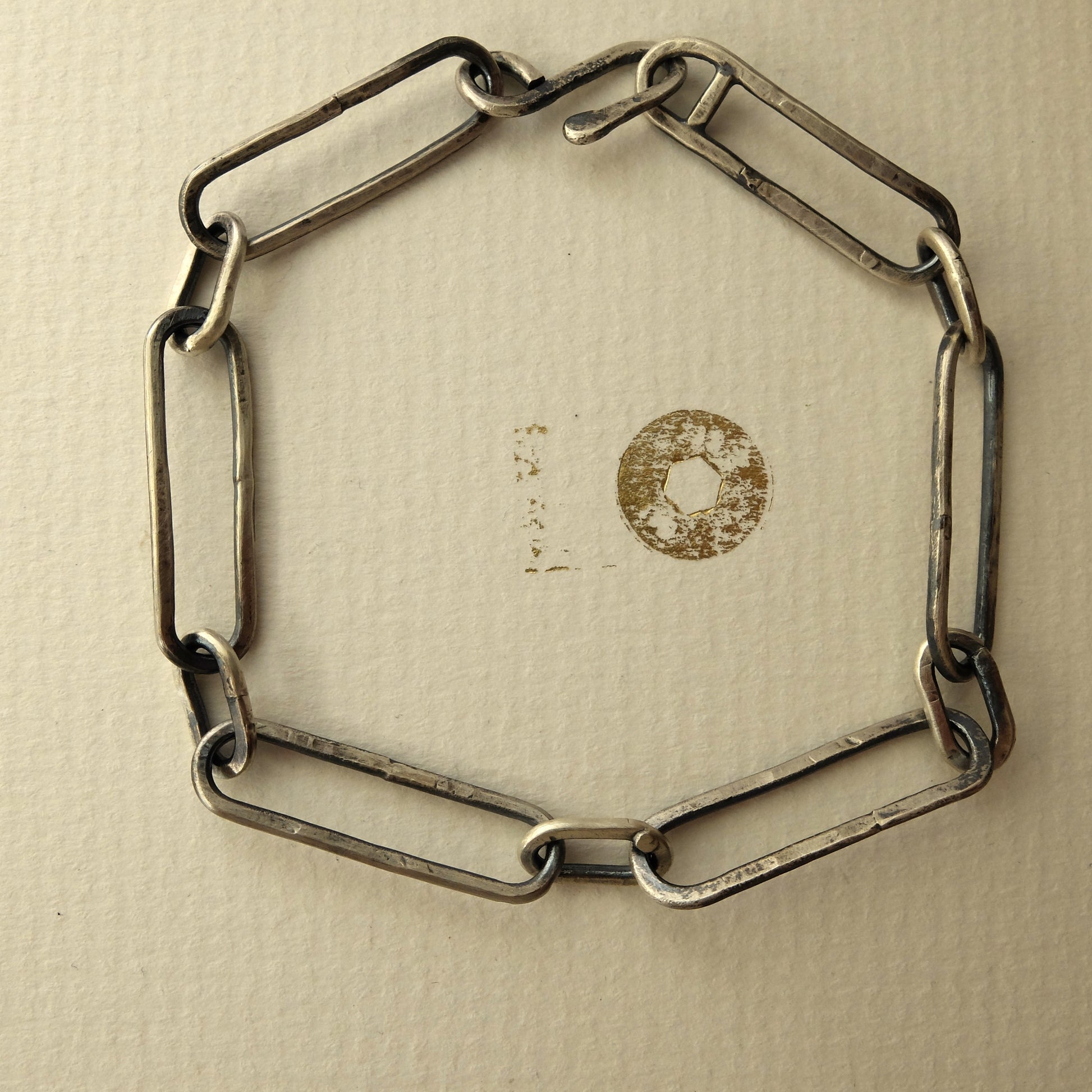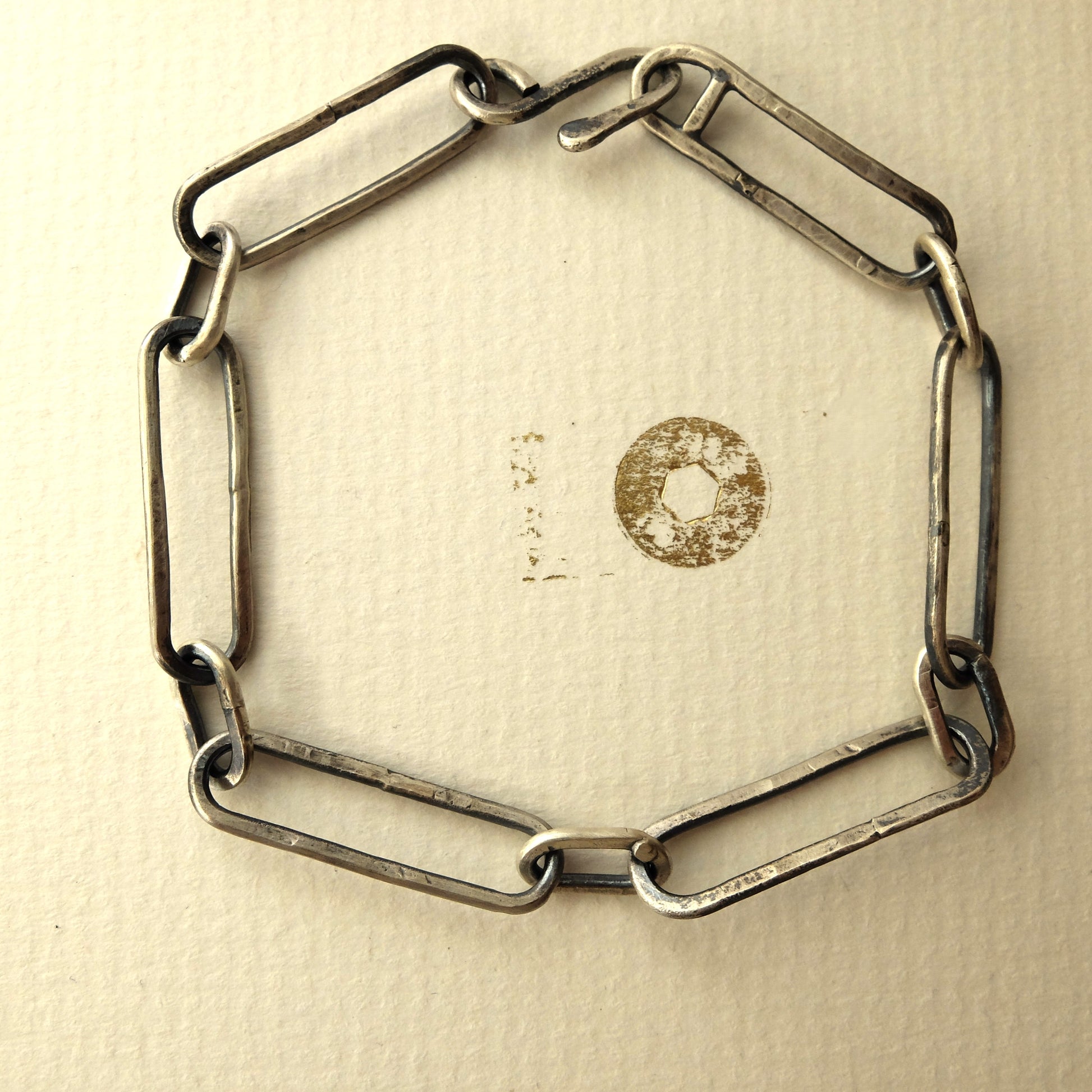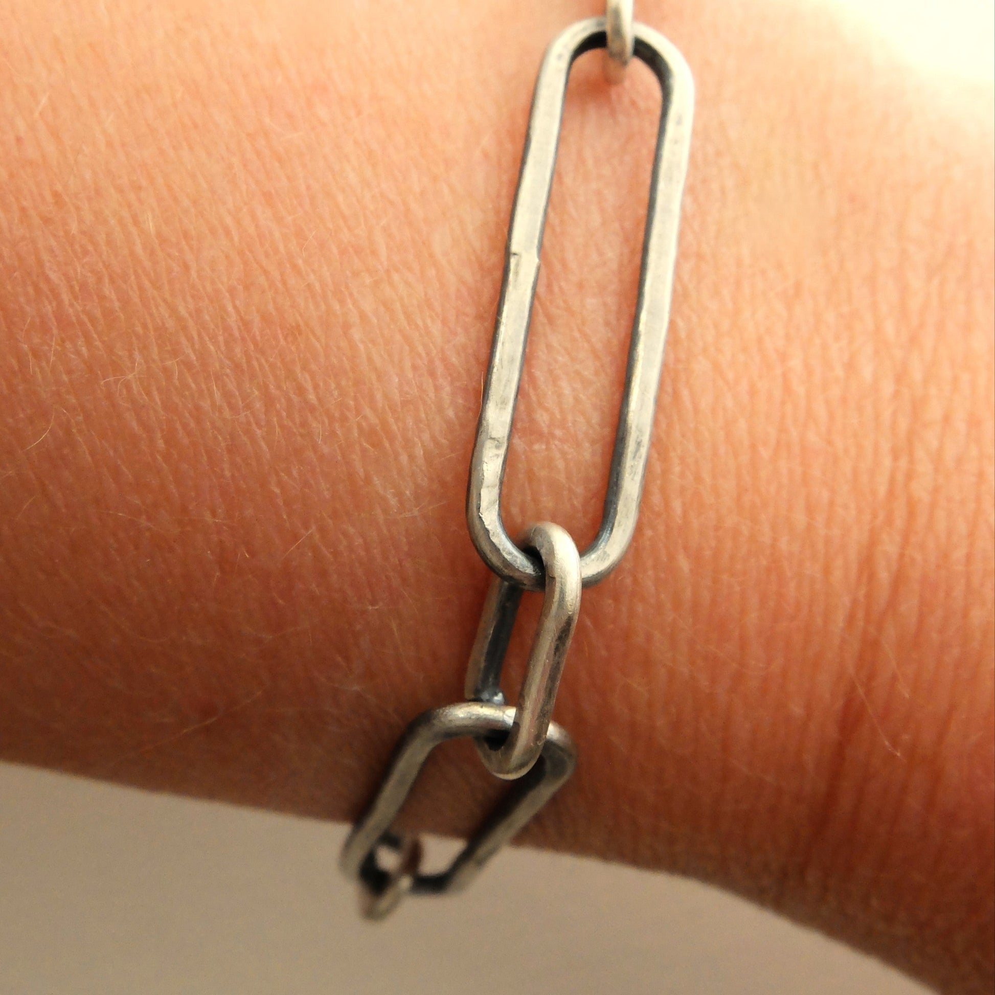 Handmade large Paperclip Bracelet with hook closure. Early primitive crafting techniques have influenced the imperfect form and texture of this design.