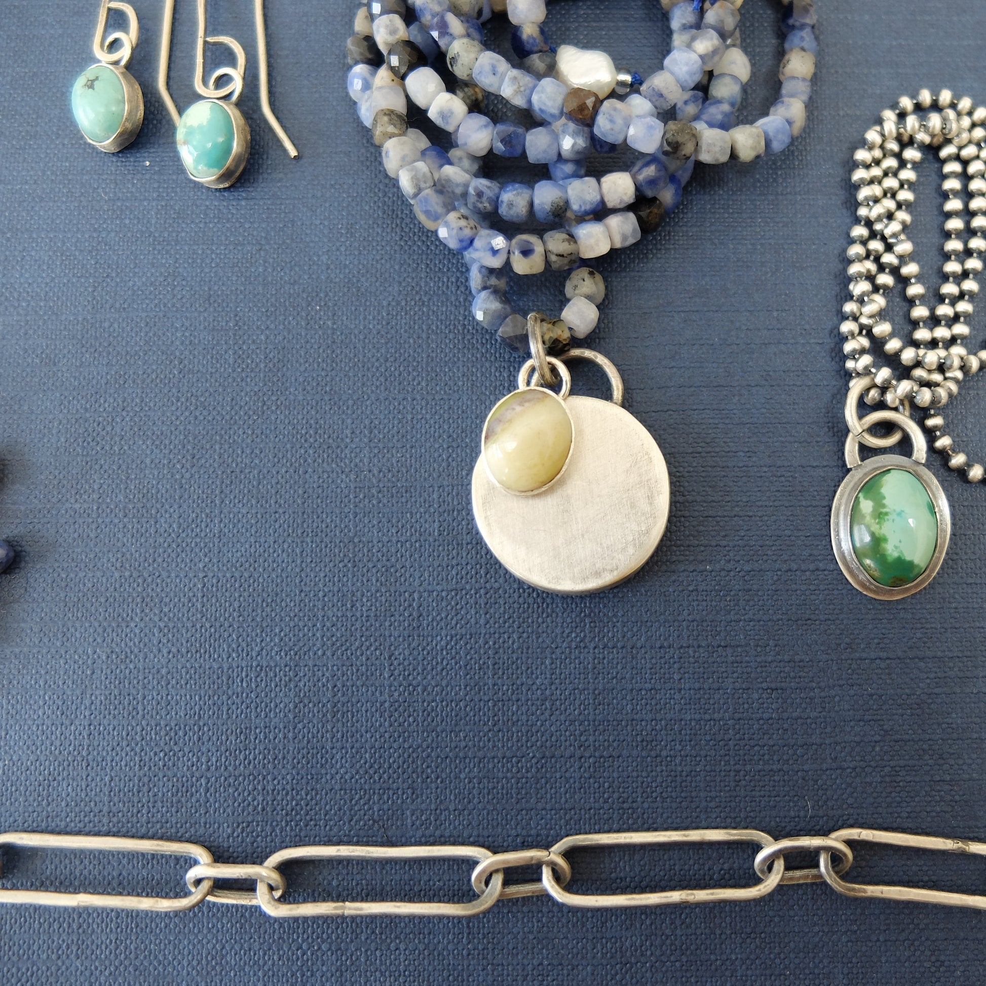 The Helga Necklace is handmade with blue sodalite cube beads with an accent of Skye Marble pendant from the Scottish Isle of Skye in sterling silver. Designed to wear stacked or solo as a statement, 32" length.