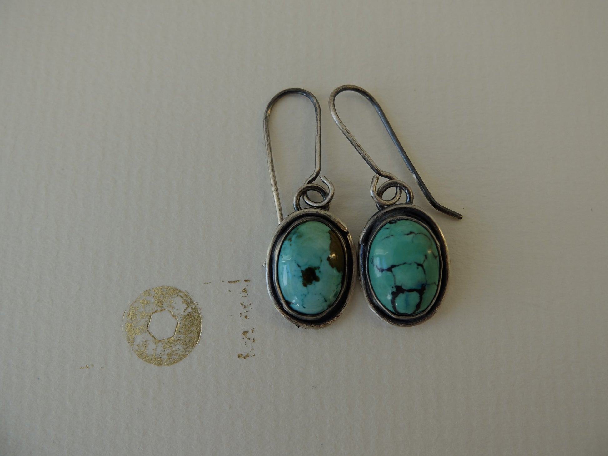 The Isabella Sterling silver drop earring with Tibetan Turquoise accent. Everything about these earrings is elegant and slightly old world. Features a oxidised matte finish and a bezel-set Turquoise oval gemstone.
