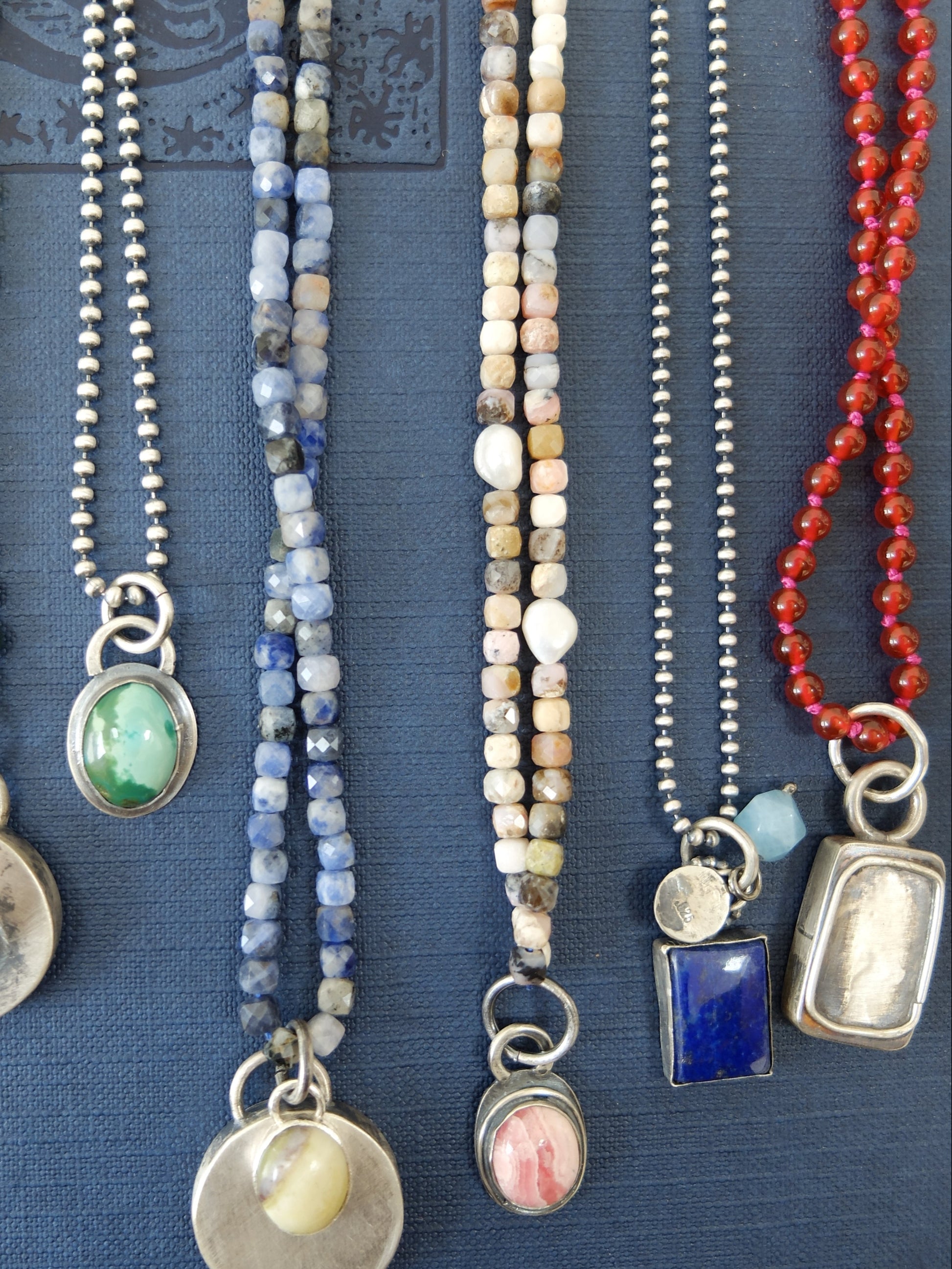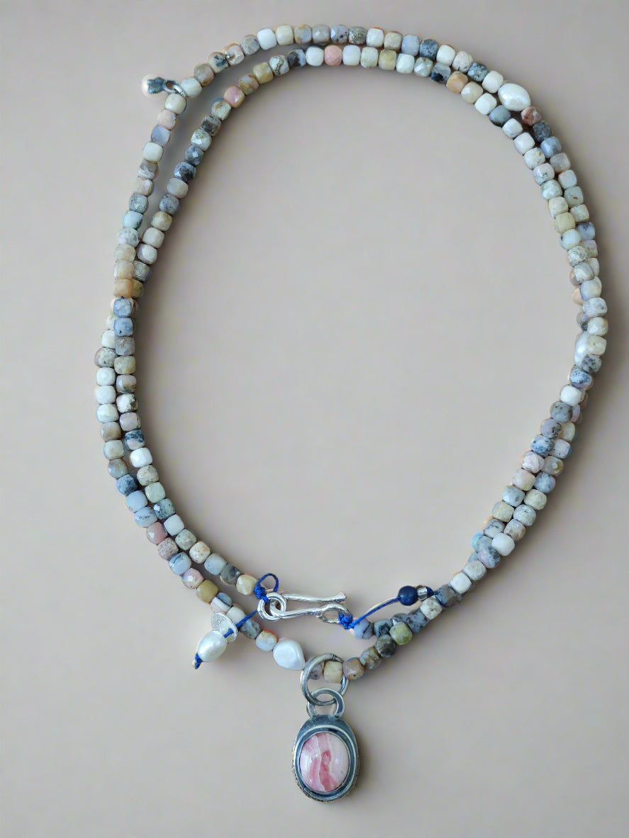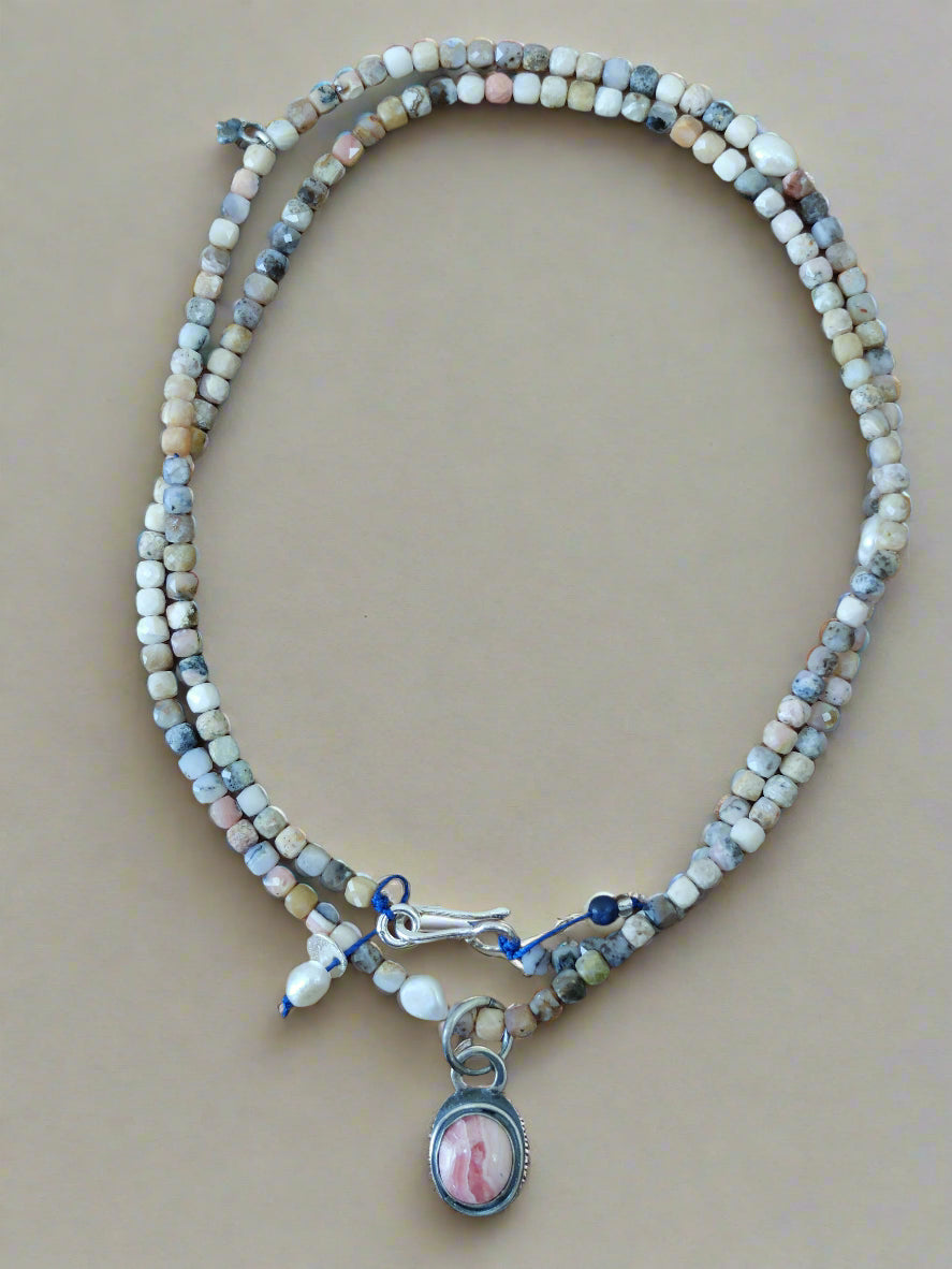 Ursa Pink Opal cube beads and Rhodochrosite Pendant in Sterling Silver