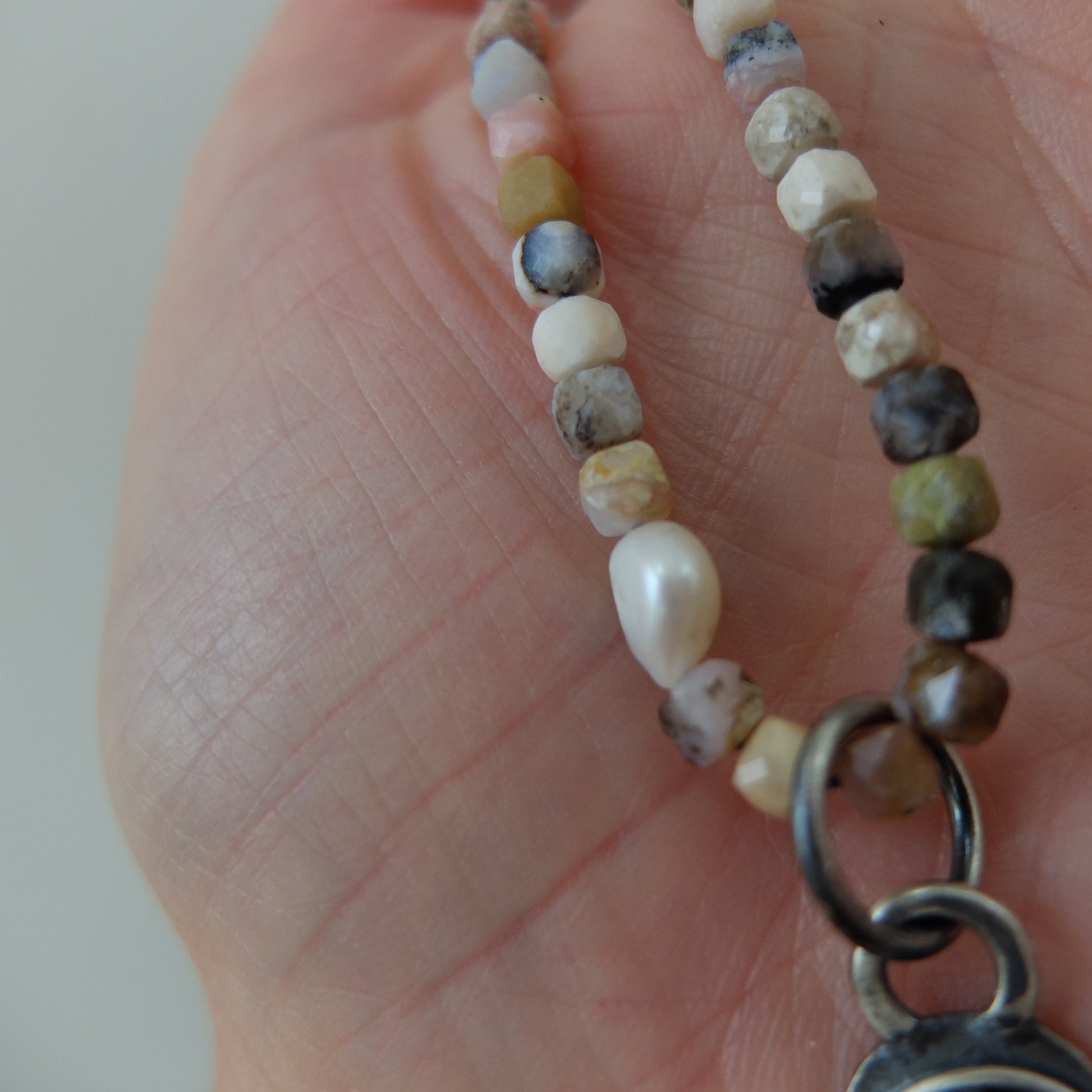 The Ursa Necklace strand is handmade with pink opals cube beads and pearls with an accent of Rhodochrosite pendant in sterling silver. Designed to wear stacked or solo as a statement, 29" length.